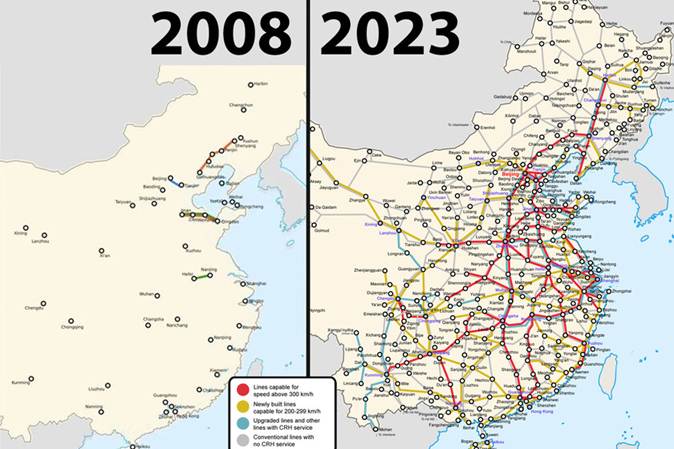 - El gigante asiático es también el país con más kilómetros de alta velocidad, tienen entre 45.000-50.000 km y concentran el 70% de todas las vías de alta velocidad del mundo. Este dato es impresionante si tenemos en cuenta que China empezó a construir su sistema de alta velocidad en el año 2008.